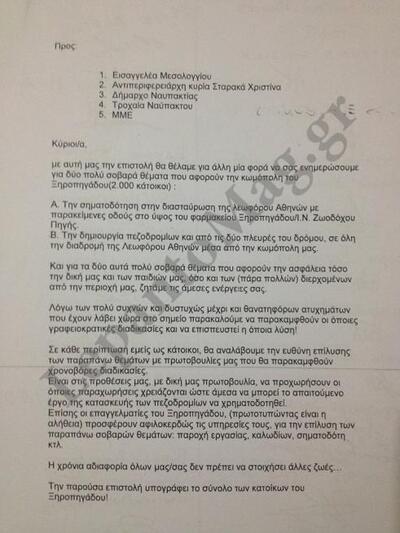 Πέραν ωστόσο της επισήμανσης από πλευράς κατοίκων για τα αναγκαία μέτρα που θα πρέπει να ληφθούν στο σημείο, γίνεται αναφορά και στη δημιουργία πεζοδρομίων κατά μήκος της Λεωφόρου που διέρχεται μέσα από την ΤΚ Ξηροπηγάδου.