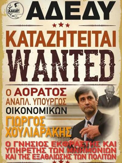 Την Α.Δ.Ε.Δ.Υ. «ανακάλυψε» για πρώτη φορά μετά τις εκλογές, ο κυβερνητικός εκπρόσωπος, με αφορμή την αφίσα που εξέδωσε για τον Αναπληρωτή Υπουργό Οικονομικών, κ. Χουλιαράκη, τον οποίο πάνω από ένα χρόνο τον «αναζητά» η Τριτοβάθμια Συνδικαλιστική Οργάνωση των Δημοσίων Υπαλλήλων για να συζητήσει μαζί του τα οξυμένα προβλήματα των εργαζομένων στο Δημόσιο και δεν τον βρίσκει πουθενά.