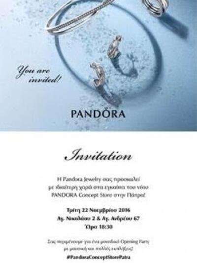 «Η Pandora Jewelry σας προσκαλεί με ιδιαίτερη χαρά στα εγκαίνια του νέου Pandora Concept Store στην Πάτρα! Την Τρίτη 22 Νοεμβρίου 2016 & ώρα 18:30. Σας περιμένουμε για ένα μοναδικό Opening Party με μουσική και πολλές εκπλήξεις!».