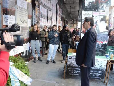 Στο πλαίσιο του τριήμερου αγωνιστικού γιορτασμού για την επέτειο της εξέγερσης του Νοέμβρη του 1973, ο Δήμαρχος Πατρέων, Κώστας Πελετίδης, η Πρόεδρος του Δημοτικού Συμβουλίου, Κατερίνα Γεροπαναγιώτη, Αντιδήμαρχοι, δημοτικοί και διαμερισματικοί σύμβουλοι πορεύτηκαν στο χώρο του πρώην Παραρτήματος του Πανεπιστημίου, προκειμένου να καταθέσουν στεφάνι. Όπως αναφέρει σχετική ανακοίνωση: