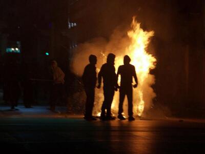 Τα ΜΑΤ απαντούν με τη ρίψη δυο δακρυγόνων. Στο δεύτερο γύρο του πετροπόλεμου, μια μολότοφ σκάει κάτω από το ΙΧ που τελικά κάηκε και το οποίο ήταν σταθμευμένο επί της Κολοκοτρώνη, πριν την Κανακάρη.