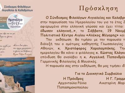 Αυτό το Σάββατο 19/11/2016 στις 18.30 το απόγευμα, στο Πολιτιστικό Κέντρο Αιγίου «Αλέκος Μέγαρης» θα παρουσιαστεί το Ημερολόγιο για το νέο έτος 2017 του Συνδέσμου Φιλολόγων Αιγιαλείας και Καλαβρύτων.