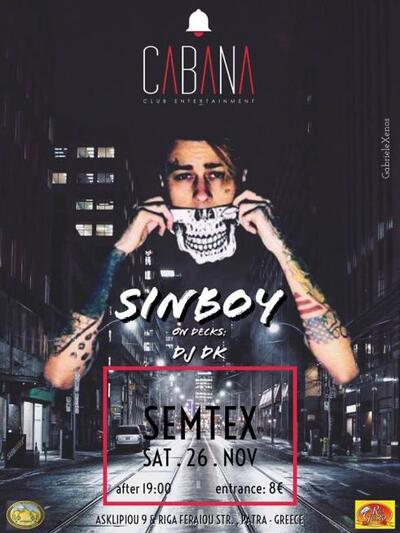 Το Σάββατο 26 Νοεμβρίου, στο Cabana θα βρεθεί ως Guest Star ο Sin Boy με σκοπό να προσφέρει μια μοναδική βραδιά, γεμάτη διασκέδαση. "On decks" θα βρεθεί ο Dj DK, για πρώτη φορά στην Πάτρα με αποκλειστικά Remix!