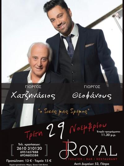 Τέλος την Τρίτη 29/11, παραμονή του Αγίου Ανδρέου στο Royal - παλιό Πτωχοκομείο, θα παρουσιάσουν στις 23.30 το μουσικό πρόγραμμα με τίτλο "Ο Δικός μας δρόμος" οι Γιώργος Χατζηνάσιος και Γιώργος Θεοφάνους.