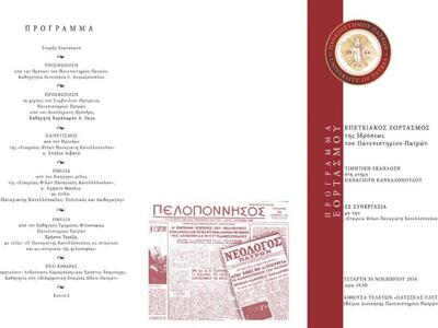 Η Πρύτανις του Πανεπιστημίου Πατρών, Καθηγήτρια Βενετσάνα Ε. Κυριαζοπούλου . Σας προσκαλεί στην εκδήλωση για τον εορτασμό της 52ης Επετείου από την ίδρυση του Πανεπιστημίου Πατρών, που θα πραγματοποιηθεί την Τετάρτη, 30 Νοεμβρίου 2016 και ώρα 19.00 στην Αίθουσα Τελετών «Οδυσσέας Ελύτης» (κτίριο Διοίκησης Πανεπιστημίου Πατρών).