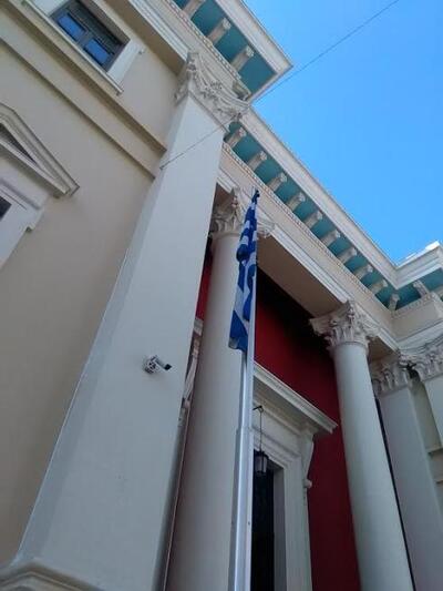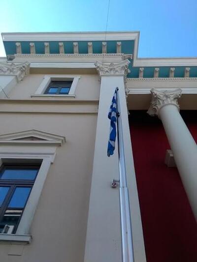 Η Ελληνική σημαία έξω από το Δικαστικό Μέγαρο Πατρών κυματίζει στο ύψος της και όχι μεσίστια, όπως προβλέπεται στο πλαίσιο του τριήμερου εθνικού πένθους για την απώλεια του Πατρινού πρώην Προέδρου της Δημοκρατίας Κωστή Στεφανόπουλου.