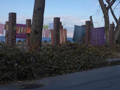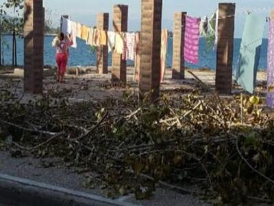 Το πολύπαθο έργο της ανάπλασης της παραλιακής ζώνης του Αιγίου, αφού γνώρισε αρκετές γραφειοκρατικές καθυστερήσεις, μπορεί πλέον να προχωρά κανονικά σε κάποια σημεία, άλλα όμως έχουν μείνει στάσιμα. Σκέφτηκε λοιπόν η νοικοκυρά της φωτογραφίας: "Γιατί αυτά τα κολωνάκια να παραμένουν άχρηστα; Ας βάλω σκοινί και ας απλώσω τη μπουγάδα μου, μιας και έχει και ήλιο!"