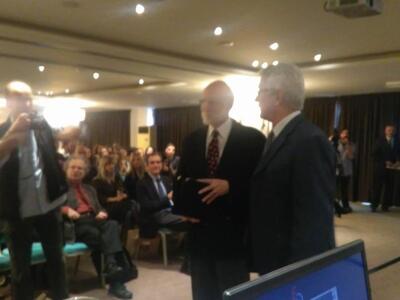Τις τιμητικές πλακέτες παρέδωσαν αντίστοιχα ο Πρόεδρος της ΟΕΦΕ Γιάννης Βαφειαδάκης και ο ΓΓ της ΟΕΦΕ Γιάννης Γερογιαννάκης.