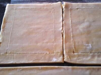 Απλώνουμε την σφολιάτα στον πάγκο εργασίας .Την κόβουμε σε τρία μακρόστενα κομμάτια. Κάθε κομμάτι το κόβουμε στα τρία. Με ένα μαχαιράκι κοφτερό και μυτερό χαράζουμε σε κάθε κομμάτι περιμετρικά ένα τετράγωνο ενός εκατοστού με προσοχή να μην κόψουμε μέχρι κάτω τη ζύμη (όπως στη φωτογραφία Νο 1).