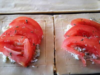 Απλώνουμε το μείγμα επάνω στη σφολιάτα. Στολίζουμε με τις φέτες ντομάτας και ρίχνουμε επάνω λίγο ελαιόλαδο και θυμάρι (όπως στη φωτογραφία Νο 2).