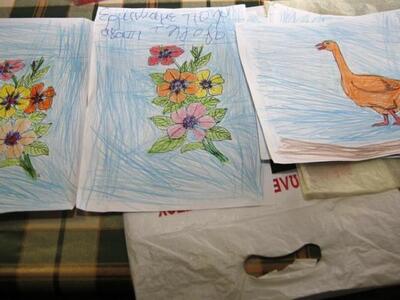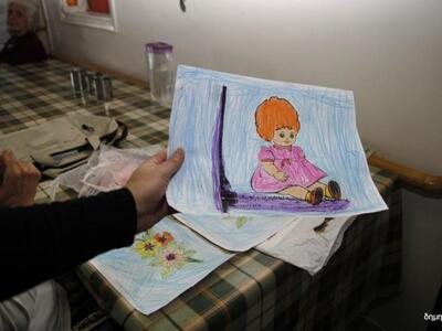 Εκεί μεταξύ άλλων συναντήσαμε τη Μαρία, που παρά την ασθένειά της, που περιορίζει τις κινήσεις της, εκείνη ζωγραφίζει. Μου χαρίζει τη ζωγραφιά της που ξεχώρισα απ΄όλες. Ένα κοριτσάκι. Και κάνει δώρο και στον φωτογράφο μας άλλη μια.