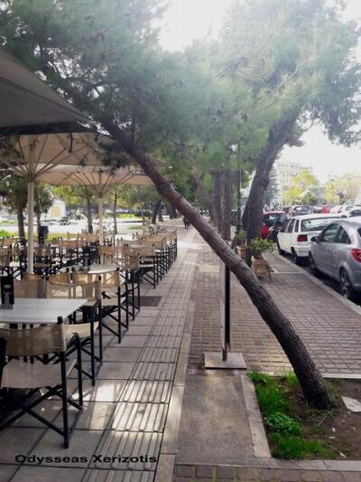Πάνω από τα κεφάλια των θαμώνων στις καφετέριες των Υψηλών Αλωνίων ...κρέμονται τα κλαδιά των πεύκων που έχουν απομείνει περιμετρικά της πλατείας. Το τμήμα πρασίνου δνε τα εχει κλαδέψει ακόμη με αποτέλεσμα ο χώρος να γεμίζει πευκοβελόνες και οι περαστικοί να κινδυνεύουν να τραυματιστούν στα μάτια αν δεν... σκύψουν εγκαίρως.