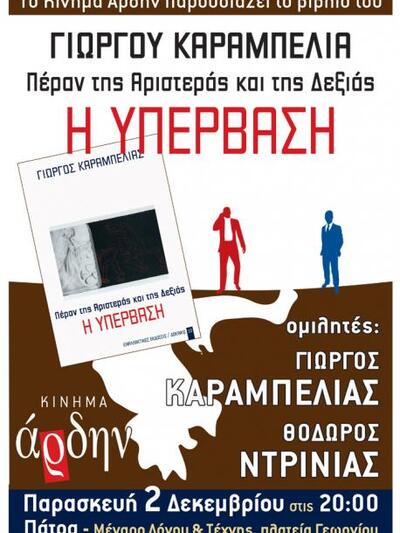 Το Κίνημα Άρδην παρουσιάζει το βιβλίο του Γιώργου Καραμπελιά Πέραν της Αριστεράς και της Δεξιάς: Η Υπέρβαση στην Πάτρα. Η παρουσίαση θα γίνει την Παρασκευή 2 Δεκεμβρίου, στις 20:00, στο Μέγαρο Λόγου και Τέχνης (πλατεία Γεωργίου). Θα μιλήσουν ο Γιώργος Καραμπελιάς και ο Θόδωρος Ντρίνιας.