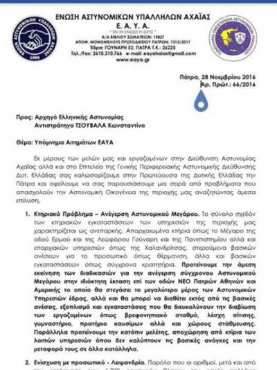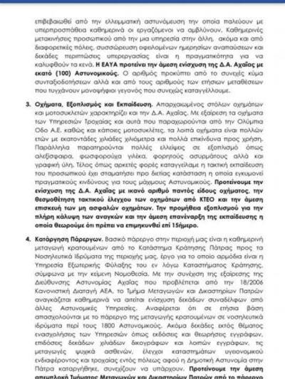 Για το κτιριακό επισημαίνεται η ανάγκη ανέγερσης νέου αστυνομικού μέγάρου στην Πάτρα, ενώ για το προσωπικό ζητά την ενίσχυση της Α.Δ. Αχαΐας με 100 αστυνομικού.