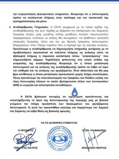 Ως προς την αναδιάρθρωση η Ένωση διαφωνεί ως προς την κατάργηση του Τμήματος Τροχαίας Αιγίου.