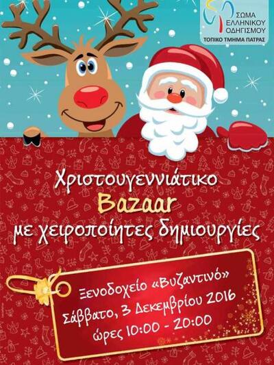 Το Σάββατο 3 Δεκεμβρίου 2016, στο ξενοδοχείο «ΒΥΖΑΝΤΙΝΟ» (Ρήγα Φερραίου 106), θα πραγματοποιηθεί το Χριστουγεννιάτικο μπαζάρ του Σώματος Ελληνικού Οδηγισμού (ΣΕΟ). Το μπαζάρ θα ανοίξει στις 10 το πρωί και διαρκέσει έως τις 8 το βράδυ.