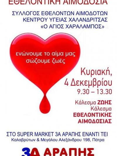 Τα «3A ΑΡΑΠΗΣ» Super Markets διοργανώνουν Εθελοντική Αιμοδοσία, την Κυριακή 4 Δεκεμβρίου 2016. Όπως αναφέρει η σχετική ανακοίνωση: