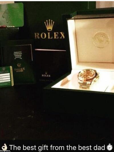 Μια από τις φωτογραφίες, που απεικονίζει ένα χρυσό Rolex, έχει ως λεζάντα: «Το καλύτερο δώρο από τον καλύτερο πατέρα».