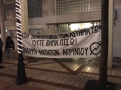 Στο δημαρχιακό μέγαρο Αγρινίου παρέμεναν μέχρι αργά χθες βράδυ οι φοιτητές των τριών Πανεπιστημιακών τμημάτων που προχώρησαν χθες το πρωί σε κατάληψη του Δημαρχείου. Αν η κινητοποίηση συνεχιστεί, δεν αποκλείεται οι υπηρεσίες του δήμου που στεγάζονται στο κτήριο του Δημαρχείου να μη λειτουργήσουν και σήμερα Πέμπτη 1η Δεκεμβρίου.