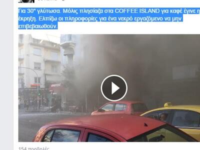 "Για 30" γλύτωσα. Μόλις πλησίαζα στα COFFEE ISLAND για καφέ έγινε η έκρηξη. Ελπίζω οι πληροφορίες για ένα νεκρό εργαζόμενο να μην επιβεβαιωθούν", έγραψε στον προσωπικό του λογαριασμό στο facebook ο πατρινός συνδικαλιστής και εκπρόσωπος Τύπου της ΓΣΕΕ Δημήτρης Καραγεωργόπουλος. Ο οποίος τα τελευταία χρόνια βρίσκεται τις περισσότερες μέρες της εβδομάδας στην πρωτεύουσα για τις ανάγκες του συνδικαλιστικού οργάνου.