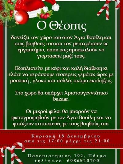 Ο Θέσπις δανείζει τον χώρο του στον Άγιο Βασίλη και τους βοηθούς του και τον μετατρέπουν σε εργαστήριο, όπου σας προσκαλούν να γιορτάσετε μαζί τους.Όπως αναφέρει σχετική ανακοίνωση: