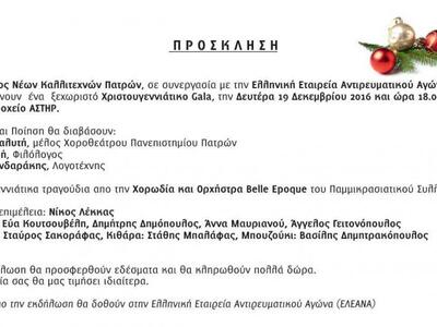Ο Σύλλογος Νέων Καλλιτεχνών Πατρών, σε συνεργασία με την Ελληνική Εταιρεία Αντιρευματικού Αγώνα (ΕΛ.Ε.ΑΝ.Α.) διοργανώνουν ένα ξεχωριστό Χριστουγεννιάτικο Gala, την Δευτέρα 19 Δεκεμβρίου 2016 και ώρα 18:00 στο ξενοδοχείο Αστήρ, στην οδό Αγ. Ανδρέου και Αράτου.