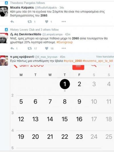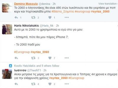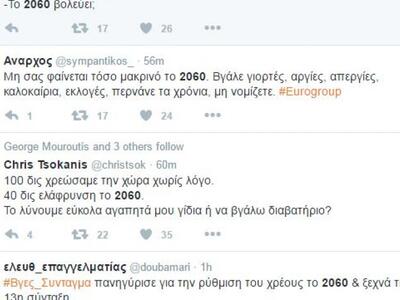 «Γλέντι» στήθηκε στο twitter μετά το Eurogroup, για την πρόθεση της Γερμανίας να διατηρήσει την πρόβλεψη για υψηλά πρωτογενή πλεονάσματα ακόμη και για μια δεκαετία μετά το 2018 αλλά και για το γεγονός ότι τα βραχυπρόθεσμα μέτρα που ανακοινώθηκαν θα έχουν ως αποτέλεσμα μια απομείωση του ελληνικού χρέους της τάξεως του 20% του ΑΕΠ της χώρας αλλά σε βάθος χρόνου και μέχρι το 2060…