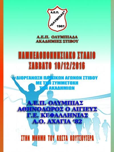 Το τμήμα στίβου της  Α.Ε.Π. Ολυμπιάδας διοργανώνει το Σάββατο στις 1030 το πρωί,  στο Παμπελοποννησιακό Σταδιο,  παιδικούς αγώνες στίβου. Οι αγώνες θα πραγματοποιηθούν στη μνήμη του παλαιού εφόρου και ιστορικού στελέχους του συλλόγου Κώστα Κουτσουγερα.