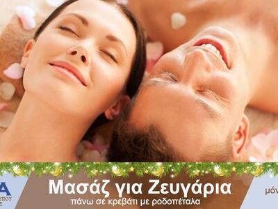 • Μασάζ για ζευγάρια (Christmas Magic) πάνω σε κρεβάτι με ροδοπέταλα σε συνδυασμό 1 ώρα μασάζ + 1 ώρα μόνοι σας στο δωμάτιο + υδρομασάζ στο Τζακούζι μαζί με κρασί ή σαμπάνια: 85 ευρώ (2 ώρες)