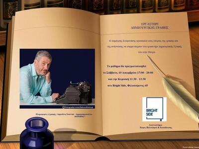 Συνεχίζεται το σεμινάριο δημιουργικής γραφής του συγγραφέα Δημήτρη Στεφανάκη, στην Πάτρα. Το νέο διήμερο μάθημα θα γίνει το Σαββατοκύριακο 10 και 11 Δεκεμβρίου, στο Bright Side, στην οδό Φιλοποίμενος 45.