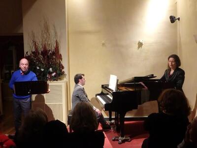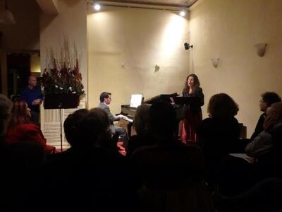 Η Δάφνη Πανουργιά στο τραγούδι με τη συνοδεία του Μάριου Καζά στο πιάνο ερμήνευσαν τραγούδια παλιών πατρινών συνθετών που δεν ακούγονται πλέον και τα οποία εντόπισε η πολυχρόνια έρευνα του Π. Ανδριόπουλου πάνω στην λόγια πατρινή μουσική παράδοση.
