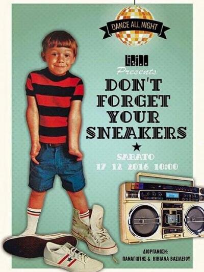 Σε mood για πολύ χορό το Libido της Veso Mare εν όψει Χριστουγέννων. Για πρώτη φορά διοργανώνει το «Don’t Forget your Sneackers Party» αναπολώντας παλιότερες εποχές ακαταπόνητου clubbing με ασταμάτητες χορευτικές επιδόσεις. Όπως αναφέρει το κάλεσμα: «Θέλοντας να θυμηθούμε τις εποχές που βγαίναμε και χορεύαμε μέχρι τελικής πτώσεως, μέχρι να μας πονέσουν τα πόδια μας και να μην αντέχουμε τα παπούτσια μας, γεννήθηκε η ιδέα για ένα party με μουσικές 80's και 90's για όλους εμάς που θέλουμε όχι απλά να κρατάμε το ποτό στο χέρι, αλλά να σταματάμε το χορό για να πιούμε... Το dress code είναι casual, δηλαδή απαγορεύονται τα τακούνια και γενικώς τα άβολα παπούτσια»