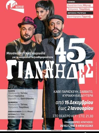 Η ολόφρεσκια μουσικοθεατρική κωμωδία "45 Γιάννηδες" για τη σουρεαλιστική καθημερινότητα, που παρουσιάστηκε για πρώτη φορά στο πλαίσιο του the Best Comedy Week 2016, ανεβαίνει στο θέατρο act για πολύ λίγες γιορτινές παραστάσεις.