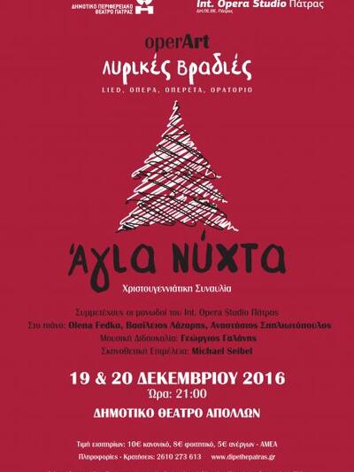 Το  Διεθνές Όπερα-Στούντιο του ΔΗ.ΠΕ.ΘΕ. Πάτρας, στο πλαίσιο της στρατηγικής του για την ανάδειξη του μουσικού θεάτρου και την προσέλκυση κοινού ώστε το λυρικό θέατρο να καταστεί προσφιλές είδος ψυχαγωγίας προσθέτει στις καλλιτεχνικές του δράσεις τις Λυρικές Βραδιές, operArt. Μία τέτοια βραδιά με τίτλο «Άγια Νύχτα» προγραμματίζεται να γίνει στις 19 και 20 Δεκεμβρίου 2016 στις 21.00 στο Δημοτικό θέατρο Απόλλων, με τη συμμετοχή των μονωδών του Opera Studio Πάτρας.