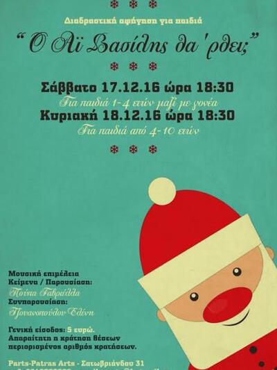 Μία διαδραστική αφήγηση για παιδιά με τίτλο “Ο Άι Βασίλης θα 'ρθει;” θα γίνει στο Parts-Patras Arts στην οδό Σατωβριάνδου 31, στην Πάτρα, ενόψει των ημερών των Χριστουγέννων και της Πρωτοχρονιάς.