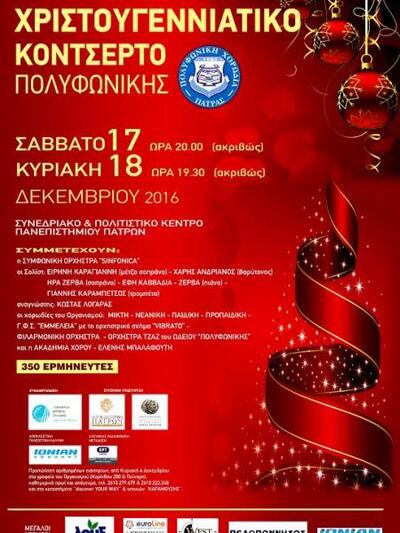 Σε τελικό στάδιο βρίσκονται οι προετοιμασίες για το Χριστουγεννιάτικο Κοντσέρτο της Πολυφωνικής Χορωδίας Πάτρας, το οποίο φέτος θα πραγματοποιηθεί δύο ημέρες, Σάββατο και Κυριακή 17 και 18 Δεκεμβρίου 2016, στο Συνεδριακό και Πολιτιστικό Κέντρο του Πανεπιστημίου Πατρών, στο Ρίο στις 8 και στις 7.30 το βράδυ αντίστοιχα και που είναι ήδη SOLD OUT από την Τρίτη.
