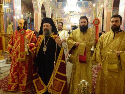 Ὁ Θεοφιλέστατος Ἐπίσκοπος Κερνίτσης κ. Χρύσανθος τήν παραμονή, ἐτέλεσε τόν Ἑσπερινό στόν Ἱερό Ναό τοῦ Ἁγίου Ἐλευθερίου Πατρῶν, ἐν πληθούσῃ Ἐκκλησίᾳ καί ὡμίλησε ἐπικαίρως, ἀναφερθείς στήν ζωή τοῦ Ἁγίου καί στά μηνύματα πού ἀπορρέουν ἀπό αὐτήν.