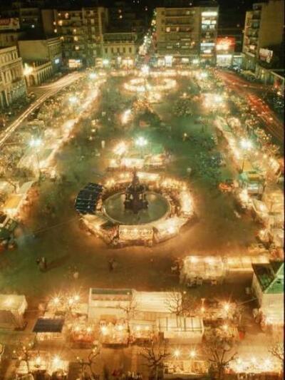 Χριστούγεννα του 1987. Η πλατεία Γεωργίου ήταν κυκλική, και ο δρόμος μπροστά από το Δημοτικό Θέατρο «Απόλλων» ανοικτός, όπως και το απέναντι σημείο. Οι μποναμάδες στον χώρο που τους γνωρίσαμε οι περισσότεροι, πριν μετακομίσουν και χάσουν κάτι από την αίγλη τους. H πλατεία σωστή...υπερπαραγωγή.