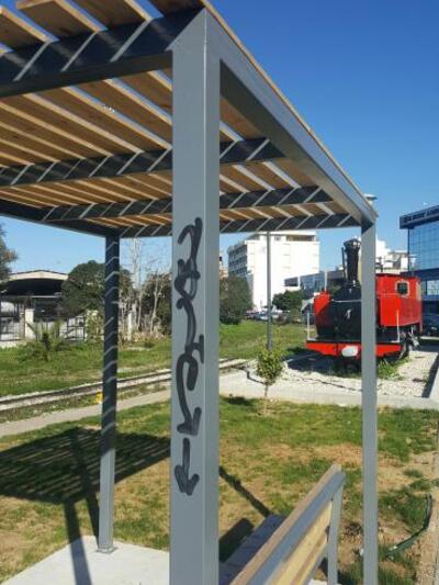 Και φυσικά - όπως εξάλλου σε οτιδήποτε όμορφο γίνεται σε αυτή την πόλη - βρέθηκαν ξανά οι συνήθεις ύποπτοι να το λερώσουν με τη.. "βρώμα" τους! Κάποια ακαταλαβίστικα συνθήματα στα μεταλικά πλαίσια του στέγαστρου και στο παγκάκι, έτσι όπως κάποιοι θέλησαν να προσβάλλουν την αισθητική μιας ακόμα φιλότιμης προσπάθειας για κάτι που κουβαλά πάνω του χρόνια ιστορίας.