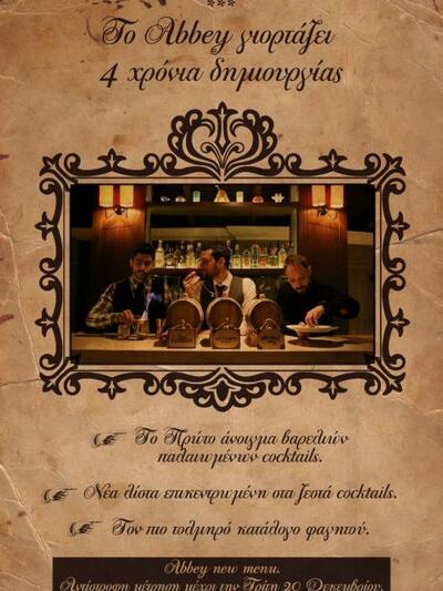 Το Abbey - Kitchen Bar γιορτάζει τα 4 χρόνια δημιουργίας και πρωτοπορίας του στο χώρο της εστίασης με: