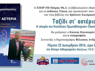 Μία γνώριμη μορφή της αθλητικής δημοσιογραφίας, ο Χρήστος Σωτηρακόπουλος θα έρθει στην Πάτρα αυτή την Πέμπτη 22/12/2016 με αφορμή το νέο του βιβλίο με τίτλο «Ταξίδι στ’ αστέρια, Η ιστορία του Κυπέλλου Πρωταθλητριών-Champions League».