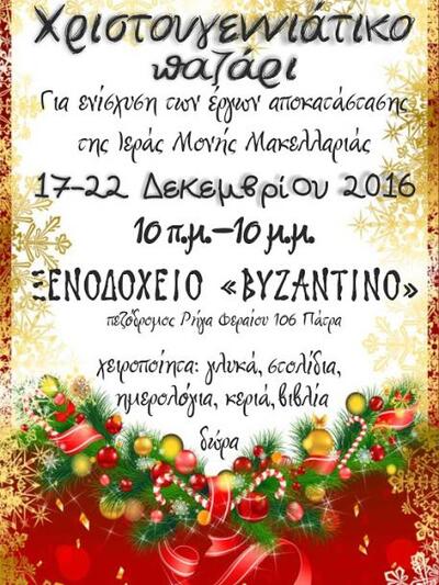 Ένα γιορτινό, Χριστουγεννιάτικο Bazaar δώρων με σκοπό την στήριξη της γυναικείας ιεράς μονής Μακελαριάς Καλαβρύτων, πραγματοποιείται αυτές τις μέρες, έως και την Πέμπτη 22/12/2016 στο ξενοδοχείο Βυζαντινόν στην Ρ. Φεραίου, στην Πάτρα.