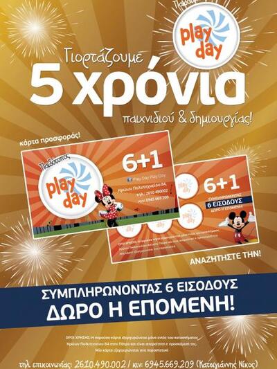 Ο αγαπημένος παιδότοπος όλων των παιδιών, με σήμα κατατεθέν τους λατρεμένους Μίκυ και Μίνι, γιορτάζει πέντε χρόνια ατέλειωτου παιχνιδιού και δημιουργικής απασχόλησης! Το Play Day που μας μύησε στην έννοια του σωστού και υπό προδιαγραφές παιδότοπου, χαρίζει σε όλους μία δωρεάν είσοδο! Αναζητήστε την ειδική κάρτα της προσφοράς, συμπληρώστε έξι εισόδους και την επόμενη φορά θα μπείτε δωρεάν. Σκέφτεστε τίποτα καλύτερο για την περίοδο των Χριστουγέννων;