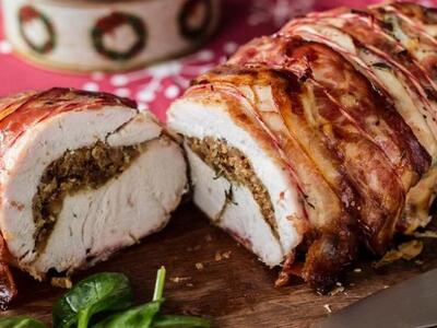 Στήθος Γαλοπούλας γεμιστό τυλιγμένο σε προσούτο με σως πορτοκαλιού και αγριόριζο.