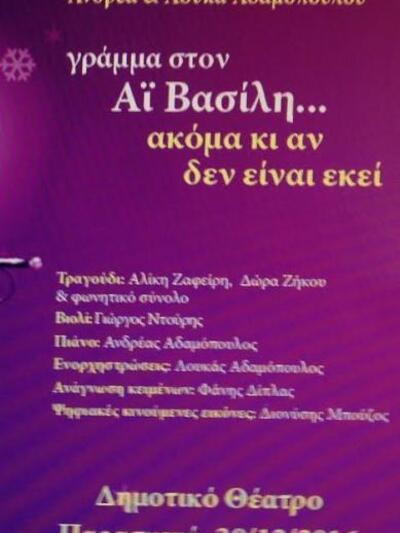 Με μια συναυλία, … «γράμμα στον Αϊ Βασίλη…ακόμα κι΄αν δεν είναι εκεί», η οποία θα δοθεί στο Δημοτικό Θέατρο «Απόλλων» στην πλατεία Γεωργίου Α’, στην Πάτρα στις 21.00 το βράδυ της Παρασκευής 30 Δεκεμβρίου 2016, οι μουσικοί Λουκάς και Ανδρέας Αδαμόπουλος, αποχαιρετούν στο πλαίσιο των εορταστικών εκδηλώσεων του Πολιτιστικού Οργανισμού Δήμου Πατρέων, το 2016 και καλωσορίζουν το νέο έτος 2017.