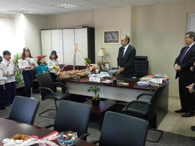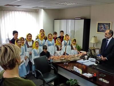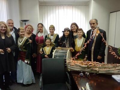 Την αρχή έκαναν τα παιδιά του Σωματείου «Φάρος Ποντίων Πατρών», τα οποία φορώντας παραδοσιακές στολές έψαλαν τα παραδοσιακά κάλαντα του Πόντου, ενώ του προσέφεραν και ένα καλάθι με ποντιακά προϊόντα.