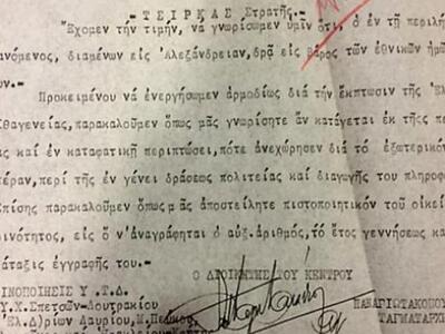 Προκειμένου να ενεργήσωμεν αρμοδίως δια την έκπτωσιν της Ελληνικής του Ιθαγενείας, παρακαλούμεν όπως μας γνωρίσητε αν κατάγεται εκ της περιφερείας σας και εν καταφατική περιπτώσει, πότε ανεχώρησεν δια το εξωτερικόν και πάσαν ετέραν, περί της εν γένει δράσεως πολιτείας και διαγωγής του πληροφορίαν.-