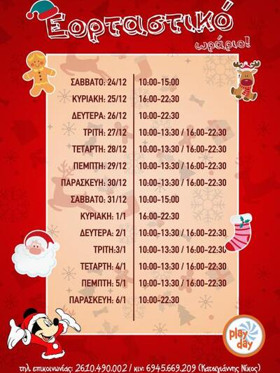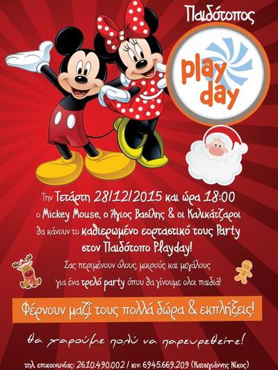 Ο Mickey Mouse, ο Άγιος Βασίλης και οι Καλικάτζαροι, μας προσκαλούν όλους σε ένα τρελό party με πολλές εκπλήξεις και δώρα, που θα μας μείνει αξέχαστο. Αυτή την Τετάρτη θα είμαστε στον αγαπημένο παιδότοπο Play Day, στην Ηρώων Πολυτεχνείου και θα γίνουμε όλοι παιδιά!