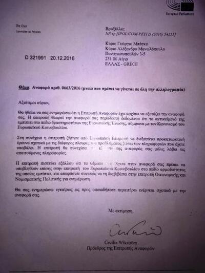 Με την υπ’ αριθμ. D 321991/20-12-2016 επιστολή της Προέδρου της Επιτροπής Αναφορών Cecilia Wikstrοn ενημερωθήκαμε ότι η αναφορά μας έγινε παραδεκτή και η Ευρωπαϊκή Επιτροπή άρχισε την διεξαγωγή προκαταρκτικής έρευνας βάσει της καταγγελίας μας.