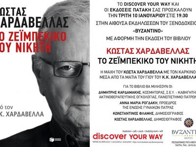 Το βιβλιοπωλείο Discover your Way στην οδό Ρ. Φεραίου και οι εκδόσεις Πατάκη συνδιοργανώνουν την Τρίτη 10 Ιανουαρίου 2017 στις 19:30 το απόγευμα, στην αίθουσα εκδηλώσεων του ξενοδοχείου «Βυζαντινό» (πεζόδρομος Ρήγα Φεραίου 106, τηλ.:2610 243 000) εκδήλωση παρουσίασης του βιβλίου «Κώστας Χαρδαβέλλας- Το ζεϊμπέκικο του νικητή».